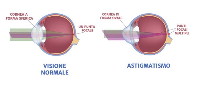 2. ASTIGMATISMO: l’astigmatismo è un comunissimo difetto che spesso si associa alla miopia e all’ipermetropia, salvo che in patologie corneali come il cheratocono l’astigmatismo non tende a progredire come la miopia. Deriva da un anomalia della curvatura corneale e determina solitamente una visione poco nitida da lontano e da vicino.